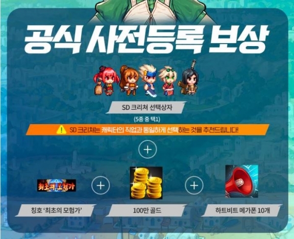 공식 사전 보상은 SD 크리처 선택상자, 최초의 모험가 칭호, 100만골드, 하트비트 메가폰 10개입니다.
