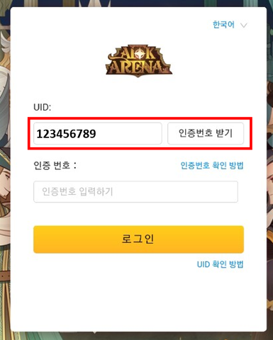 3. AFK 아레나 개인 UID를 입력하고, 인증번호 받기를 누릅니다.